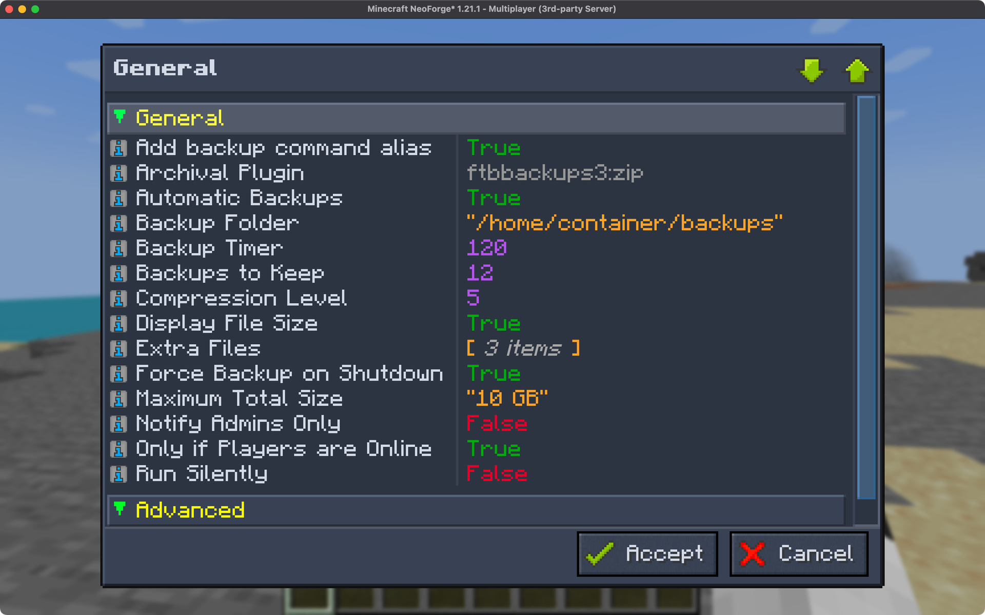 FTB Backups 3 can be configured either in-game by opening the FTB Backups 3 menu from the inventory screen or by editing the ftbbackups3-server.toml located in the config folder.